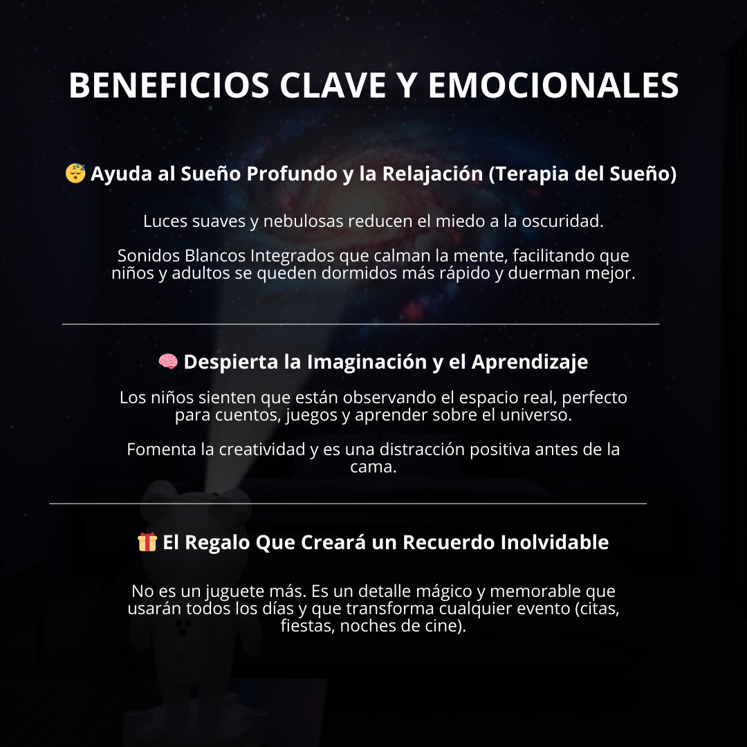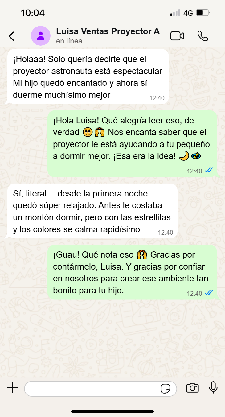 "Compré este proyector para el cuarto de mi hijo y no puedo creer lo feliz que quedó. Las estrellas, la nebulosa, la música bluetooth… se queda dormido sin quejarse ¡y nosotros respiramos tranquilos! Gran regalo"